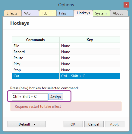Navigate to the Hotkeys tab. Click to choose the Command you wish to assign a hotkey to. For instance, we'll select Cut, which stops the current recording and starts a new one instantly.